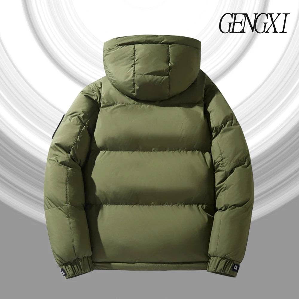 Compared to thin windbreakers this jacket is thicker and intended for winter warmth. Unlike fixed-hood coats you can remove the hood for layered looks or machine care. The product is listed under brand GENGXI model 075 and made in Mainland China with a clear size chart to help you choose the right fit.