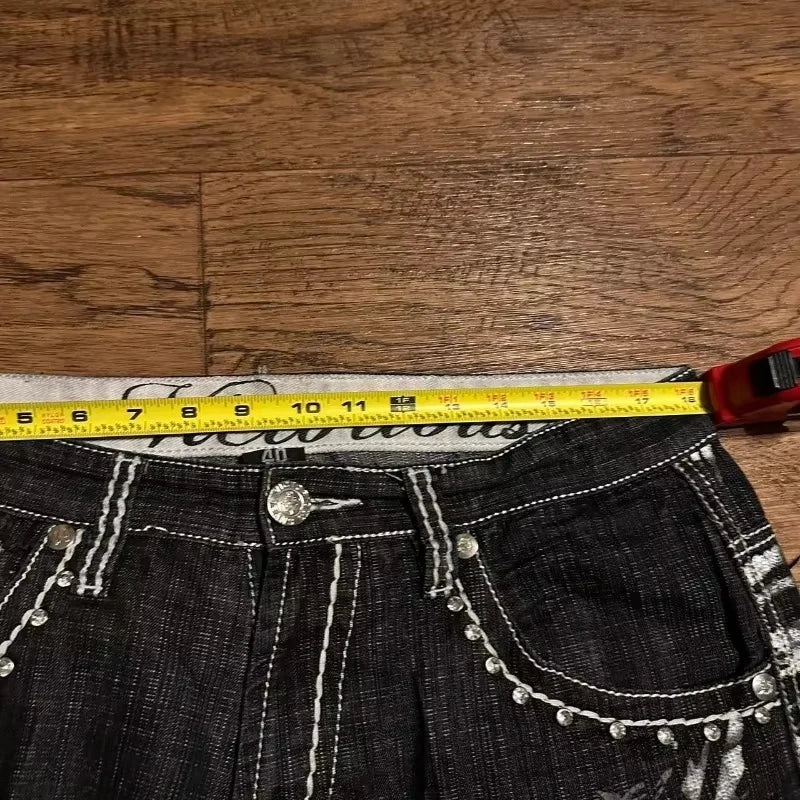 These baggy embroidered denim shorts are a loose-fit casual garment made from a cotton and polyester blend broadcloth. They offer a low-waist streetwear silhouette with embroidered letter detailing for a Y2K/gothic casual look and practical button fly closure.
