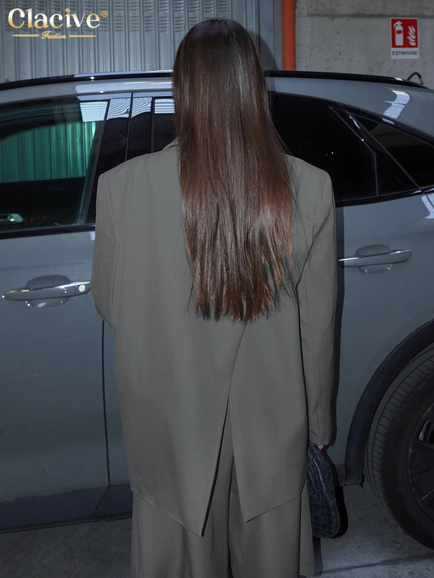 This is a Clacive gray loose two-piece office set for women consisting of a long-sleeve single-breasted blazer and high-waist shorts. The set delivers a relaxed office silhouette with woven polyester spandex fabric that is non-stretch and designed for all-season wear.