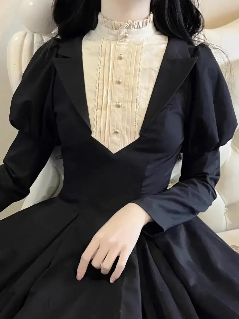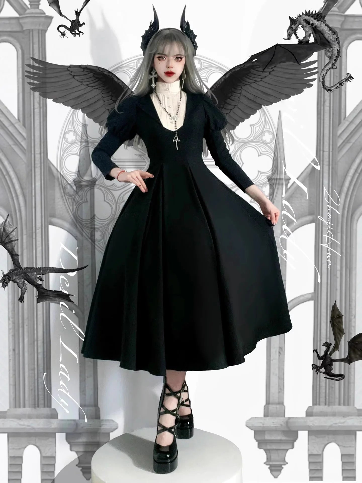 This vintage Gothic black Lolita dress is a mid-calf A-line ball gown made from a cotton blend. It provides a structured slim-fit look with a large puffy hem and full lantern sleeves for classic Lolita styling and wearable comfort.