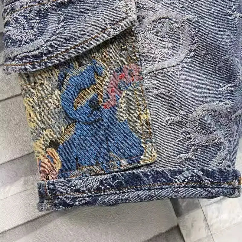 Use cases include daily casual wear, streetwear looks, festival outfits, or layered Y2K styling. Unlike heavy denim shorts, this thin summer denim is intended for warmer weather and provides improved airflow compared to thick heavyweight jeans. Compared to chino shorts these retain a denim look with embroidered decoration for distinctive styling.