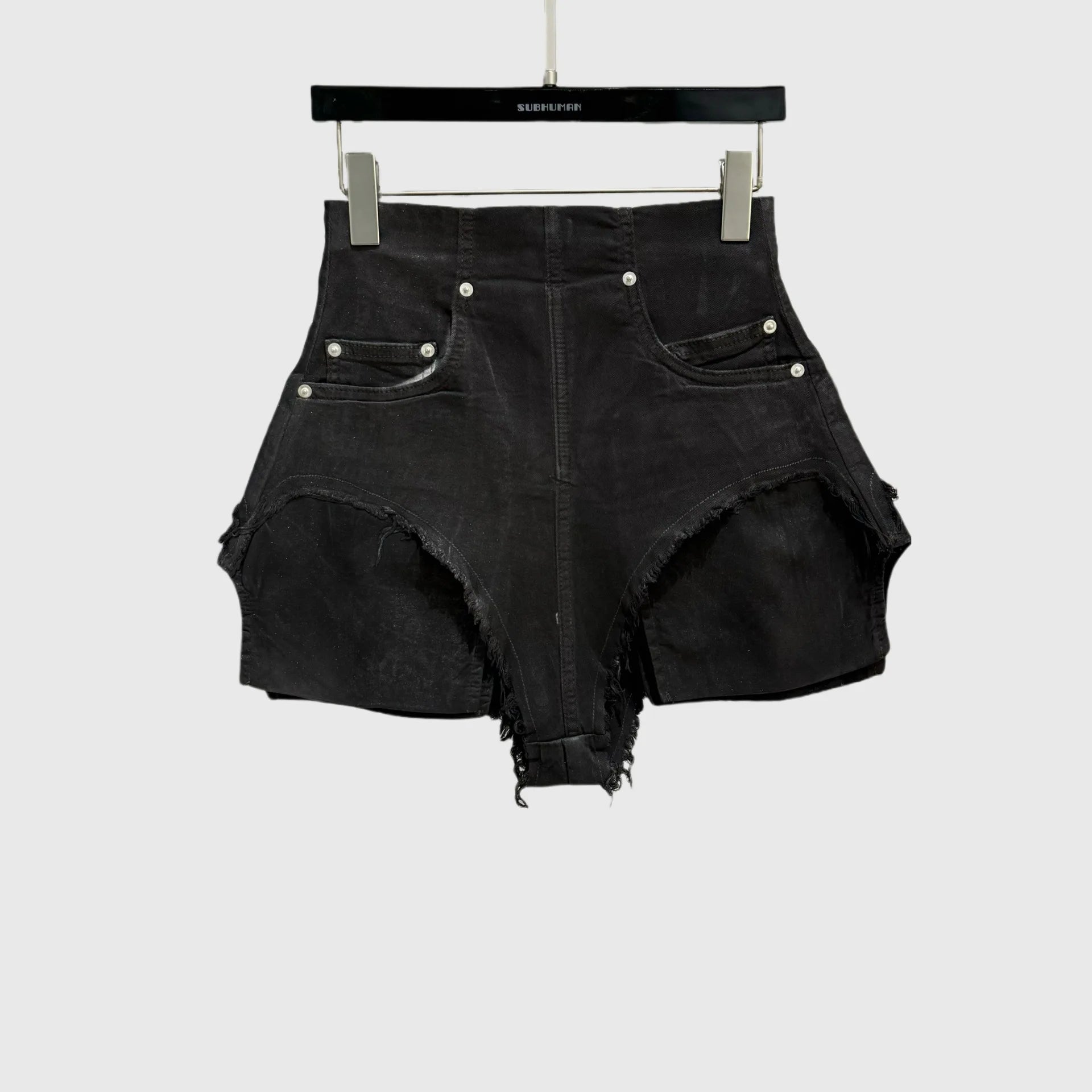 These High Street Dark RO Jeans Shorts are mid waist cotton denim shorts with a washed worn-out finish and triangular pocket design that provide casual high-street styling and everyday wearability.