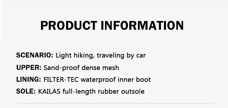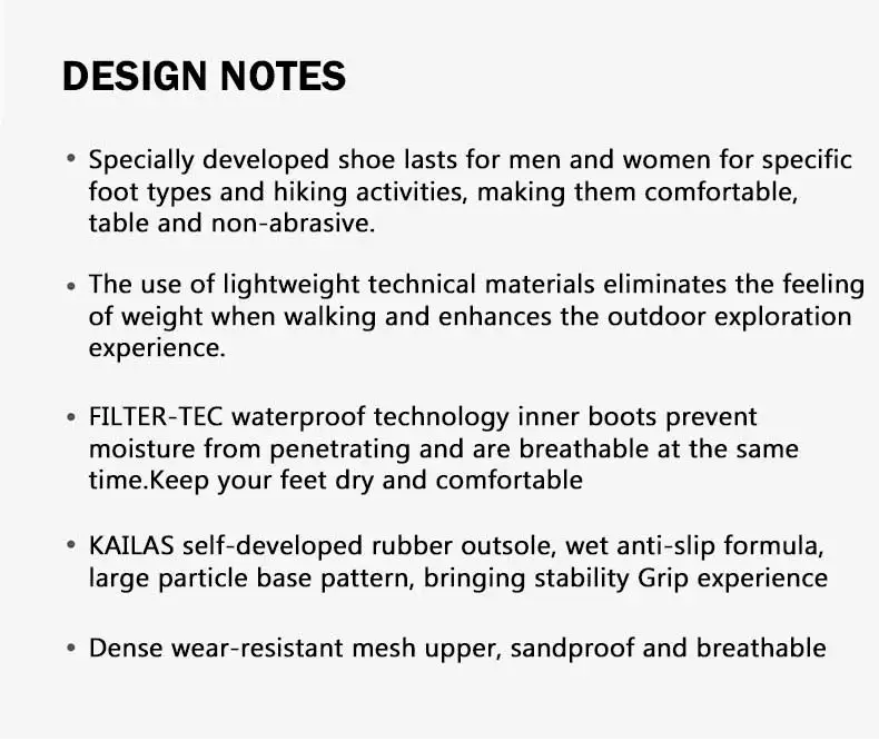 With its ergonomic fit and reinforced toe cap, the KAILAS Expedition-4 FLT ensures both protection and agility on challenging trails. Whether navigating rocky paths or muddy slopes, these hiking shoes are your reliable companion for any adventure.