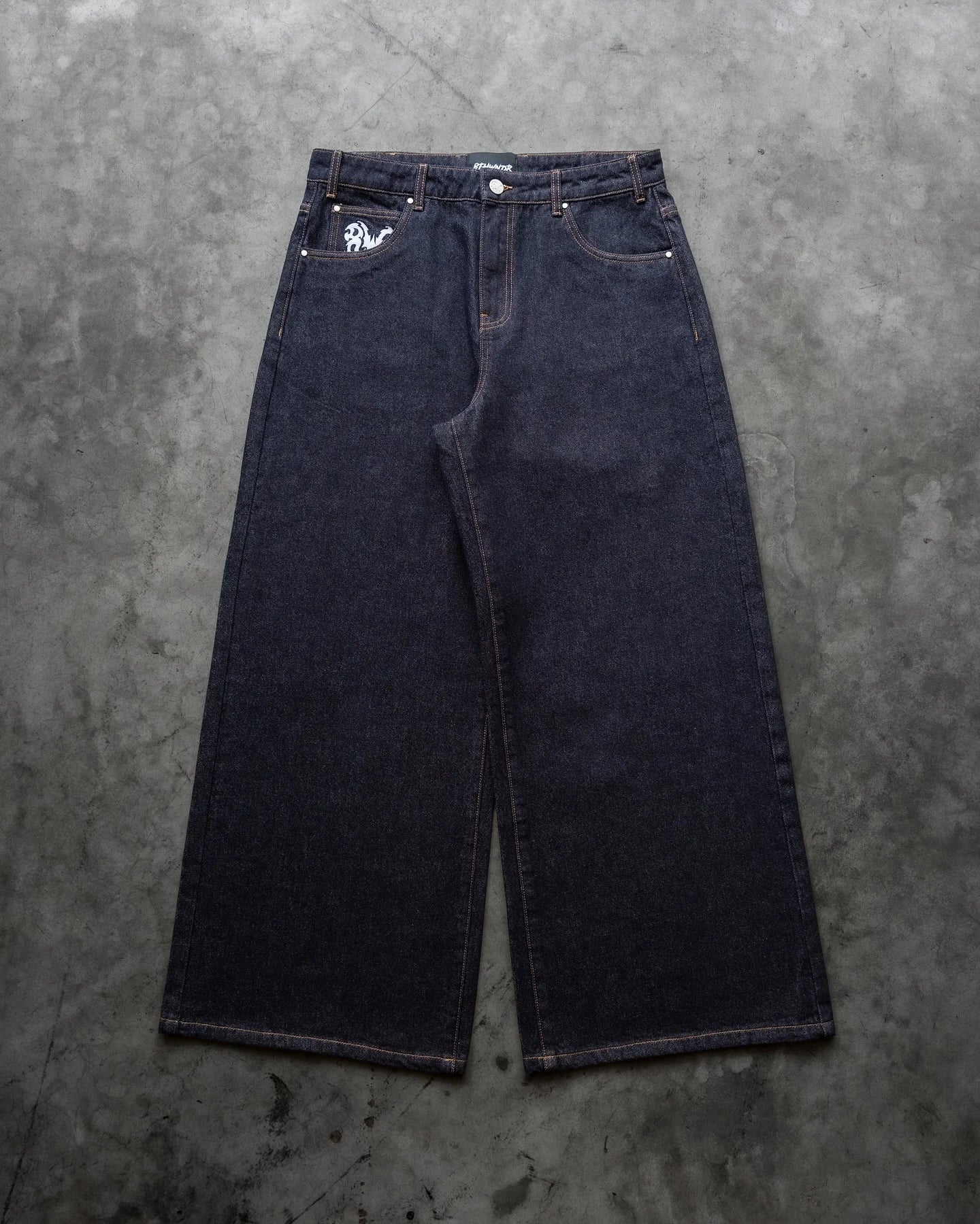 Men's baggy embroidered denim jeans with a high waist provide a loose straight-leg silhouette in midweight denim designed for autumn trips and everyday streetwear.