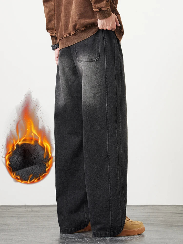 These men's fleece-lined denim pants provide insulated warmth for daily winter wear. The fleece inner traps heat while the cotton-blend outer resists wind and delivers a straight wide-leg silhouette for comfortable layering.