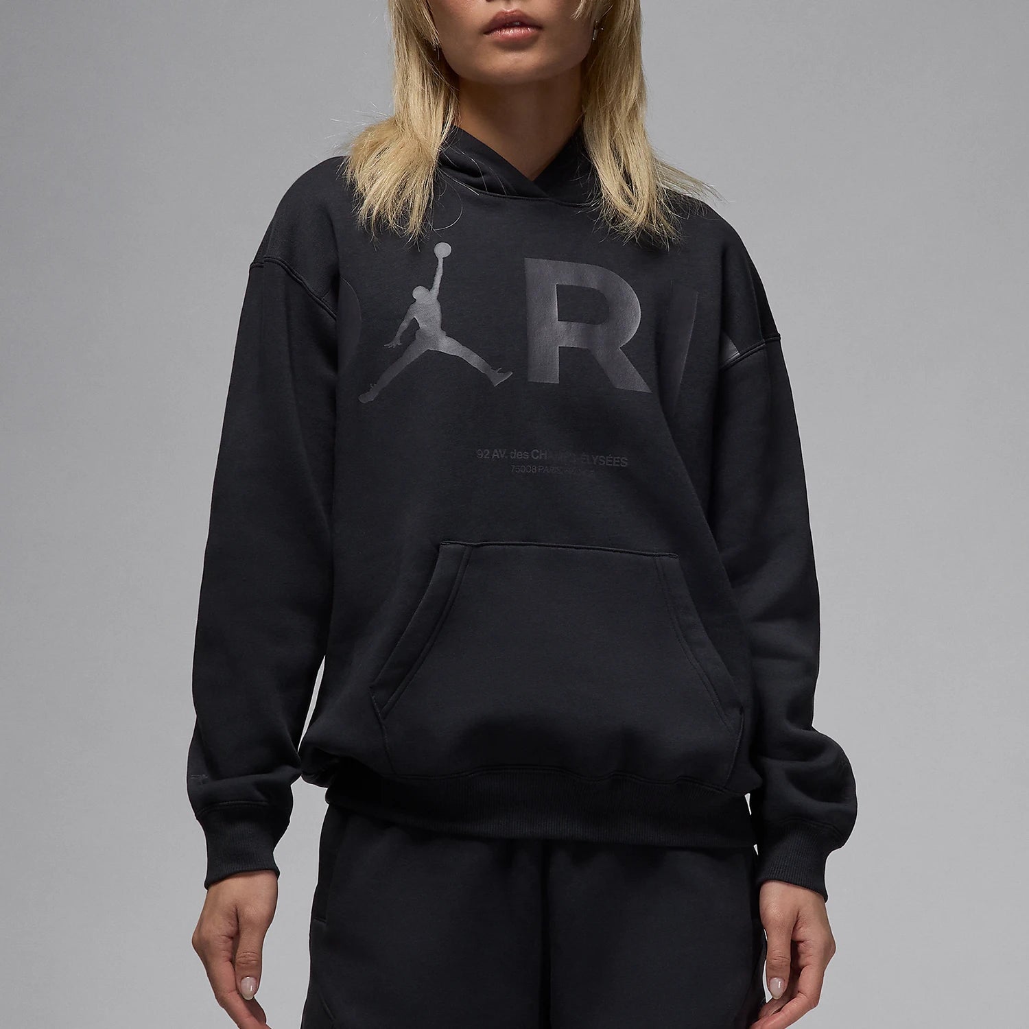 This Nike Women's Jordan fleece-lined hooded pullover (model FV7755-045) is a warm polyester sweatshirt designed for cold weather layering. The fleece lining delivers thermal insulation while the hood provides added coverage for wind and chill.
