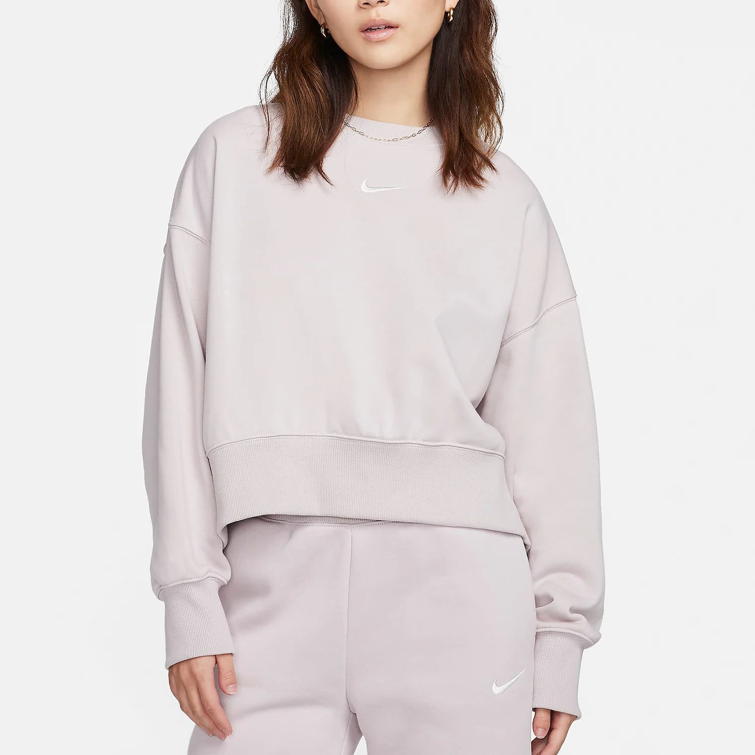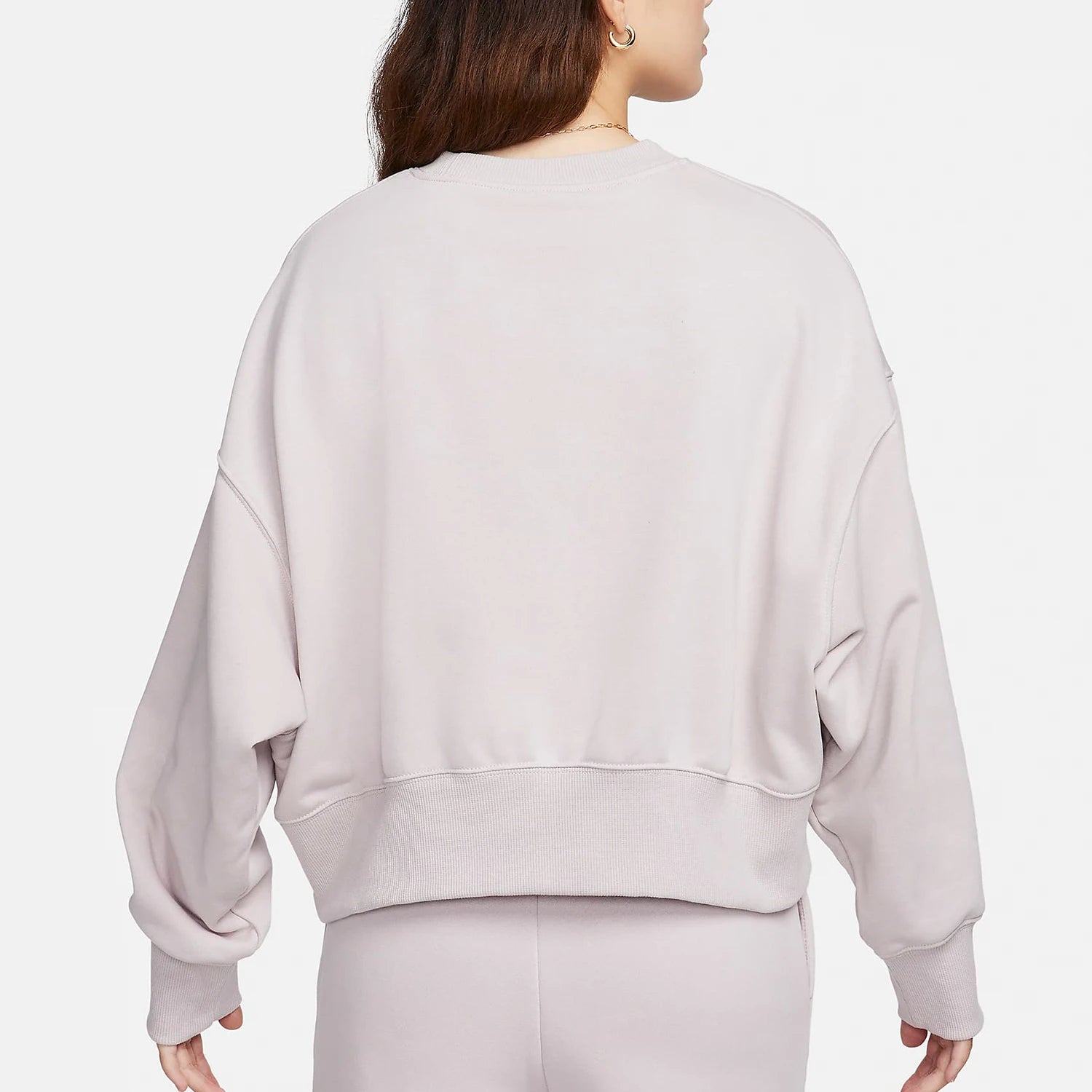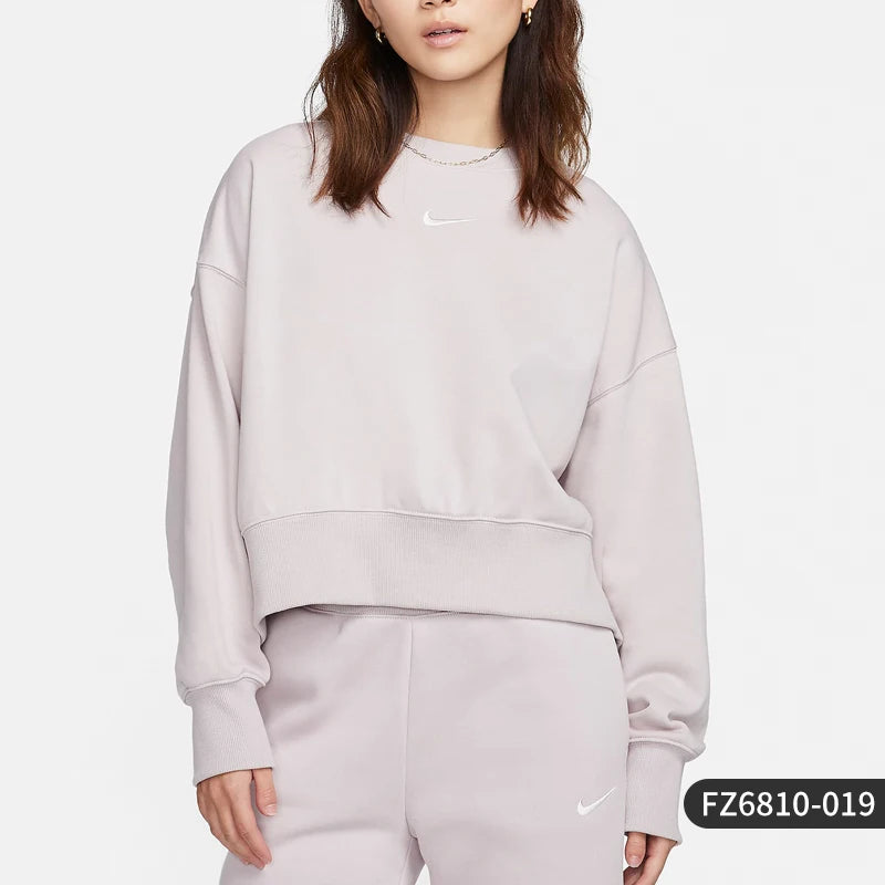 This is a Nike women's round neck loose knit sweatshirt (model FZ6810-019) designed for spring layering. Constructed from polyester with a relaxed silhouette the sweatshirt provides breathable lightweight coverage for everyday wear.