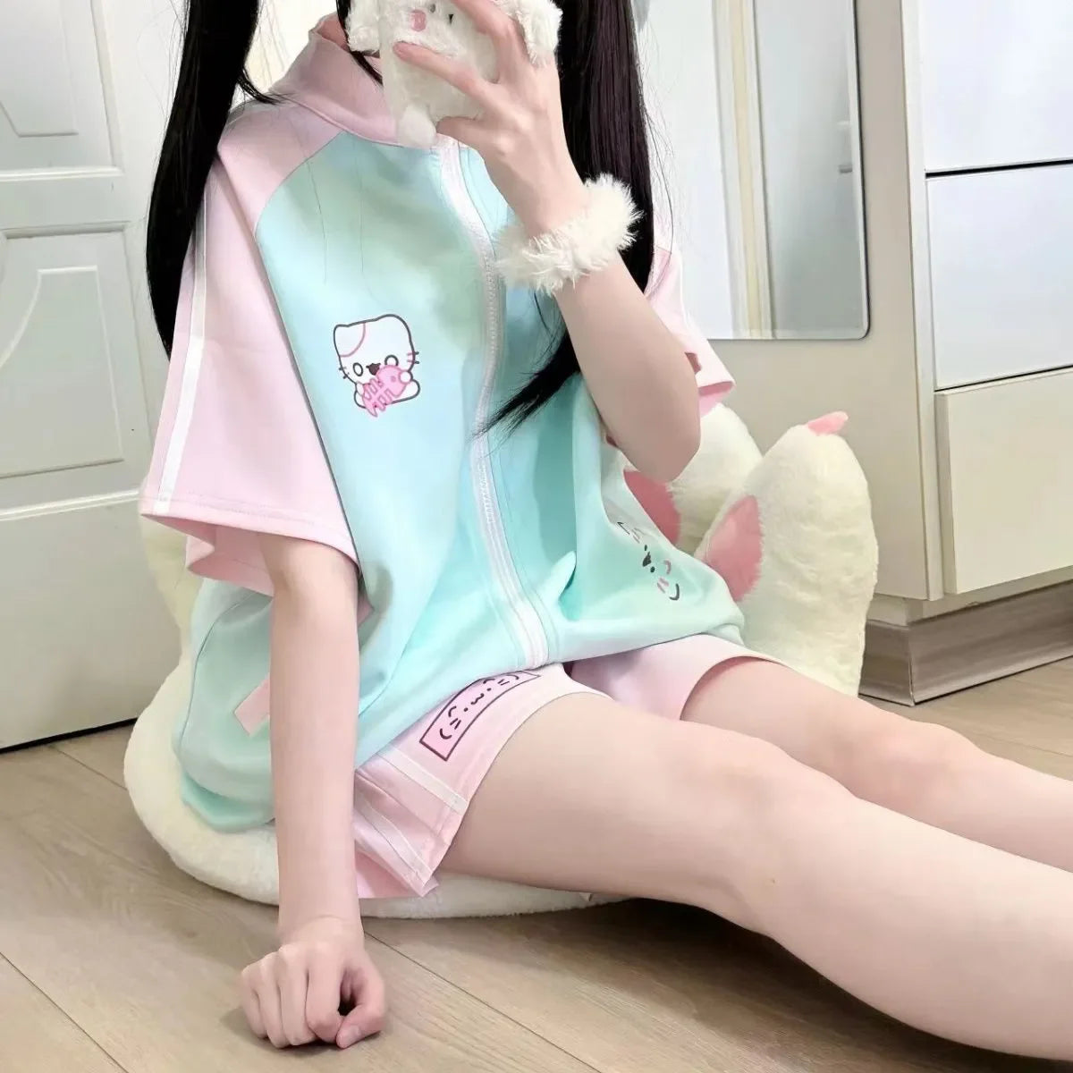 • Set composition: Short-sleeved zipper top plus tie-up high-waist shorts certified as a 2-piece set by the brand ajdsscl