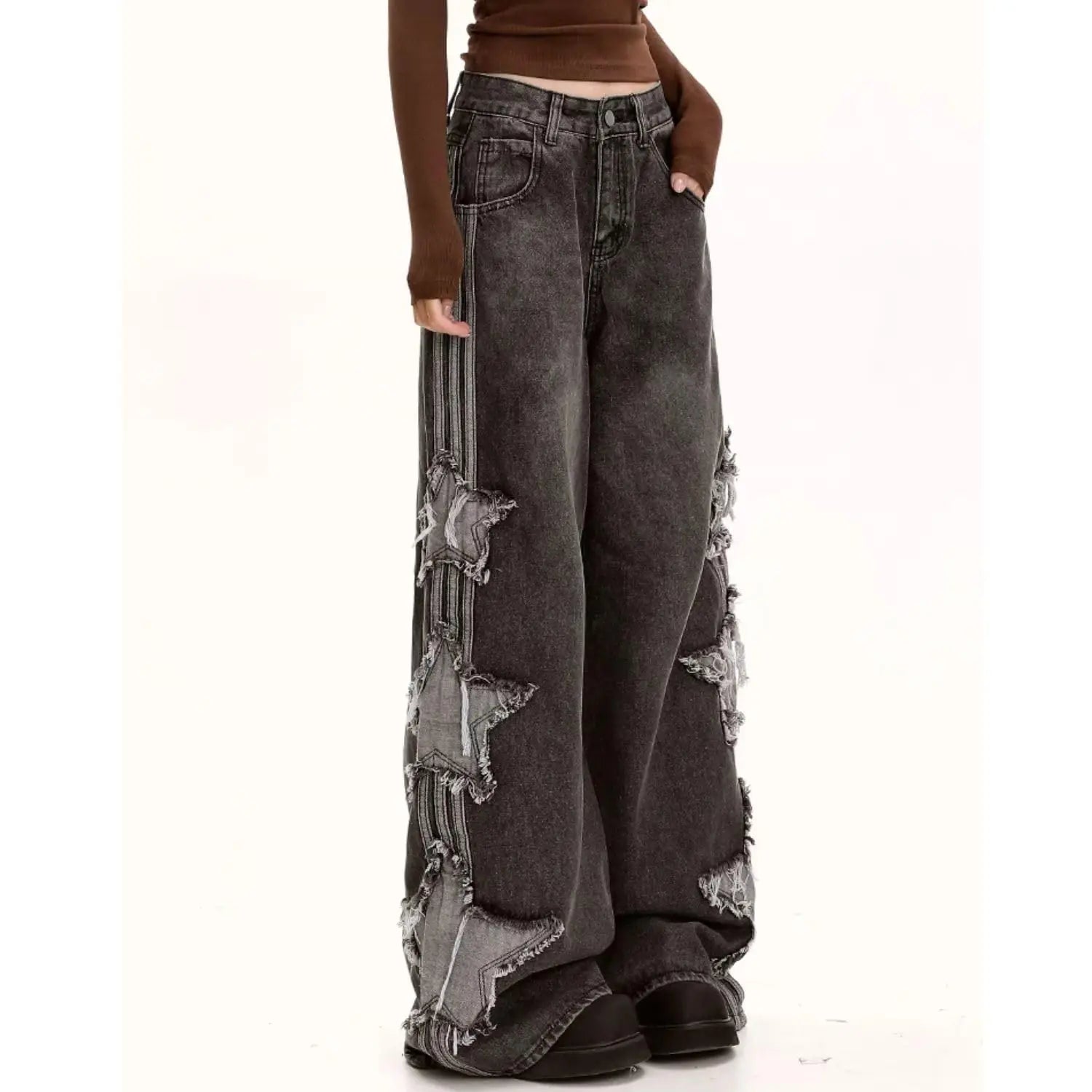 Use these jeans for casual everyday wear streetwear or themed Y2K looks paired with sneakers crop tops or layered outerwear. Unlike rigid skinny jeans these provide roomier hips and thighs and compared to plain straight denim these include decorative patchwork and a garment wash for a distinct aesthetic.