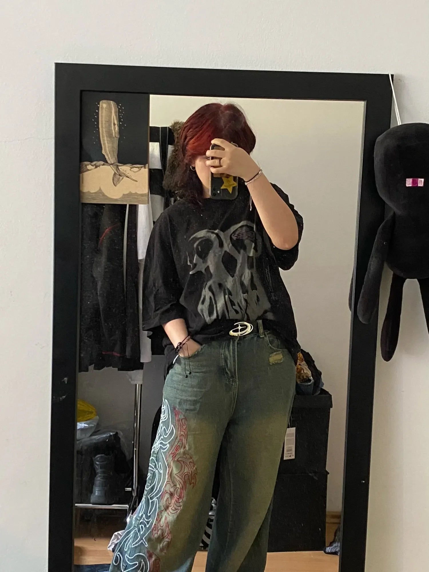 These streetwear baggy denim jeans feature geometric embroidery on midweight denim for a loose wide-leg fit. Designed for casual high-street and Y2K hip hop looks they use a button fly low waist and full-length cut to balance vintage style with everyday wear.