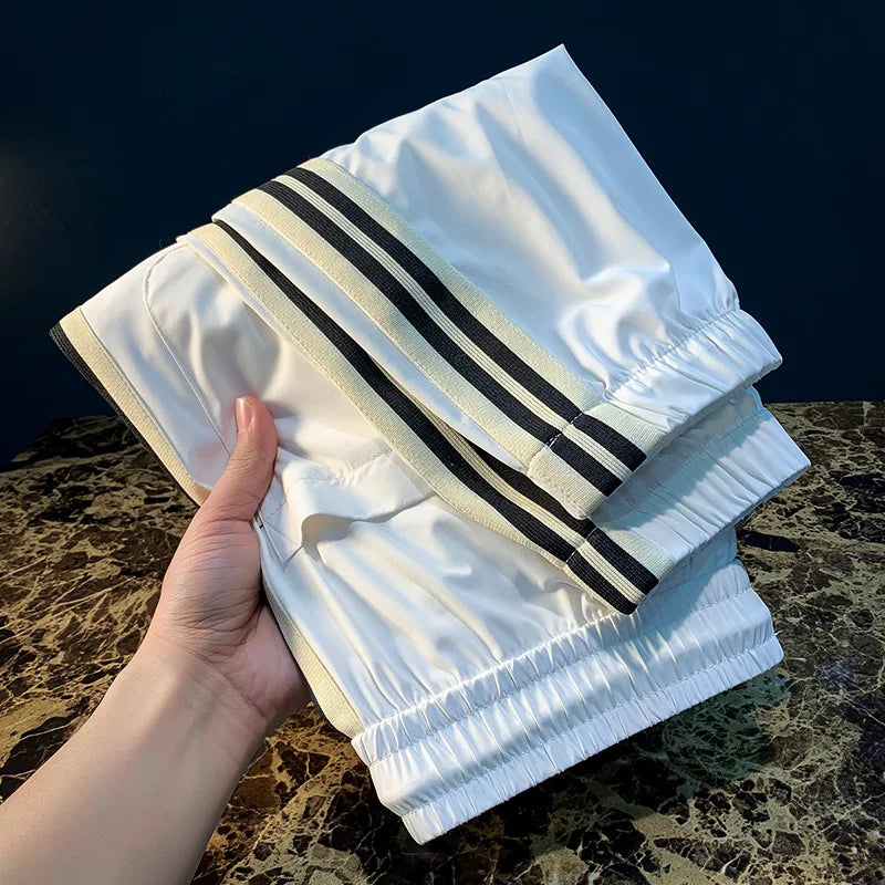 These Summer thin ice silk casual pants for men deliver breathable lightweight comfort for warm-weather wear. They feature an elastic waist, mid-waist regular fit, and an ankle-length cut suited for casual and sports scenes.