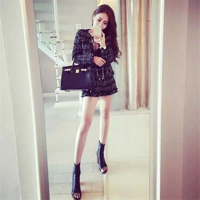 The Sweet Hot Girl Suit is a women's tweed wool two-piece set that pairs a structured woolen tweed coat with high-waisted plaid shorts for autumn and winter. It provides coordinated warmth and a tailored layered look for seasonal wear.