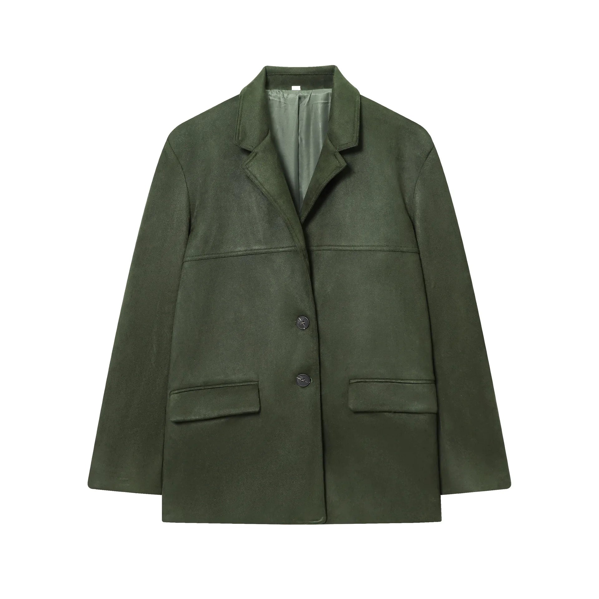This is a two-piece women's faux suede blazer and mid-rise mini shorts set made from a polyester-blend suede-effect fabric with interior lining. The set delivers a tailored blazer look with lightweight suede-effect texture suitable for autumn and winter layering.